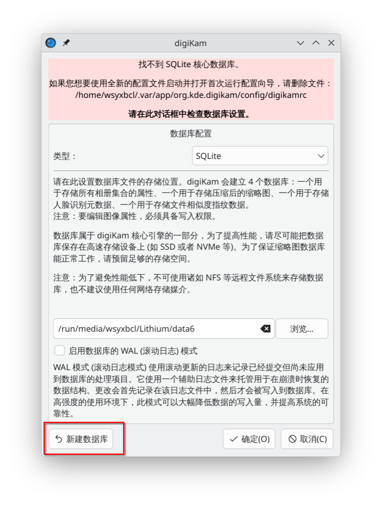 由于数据库位置(比如之前的移动硬盘)已不存在,digiKam 会做如下报错,选中新数据库位置(比如新移动硬盘的根目录),点击左下角【新建数据库】即可