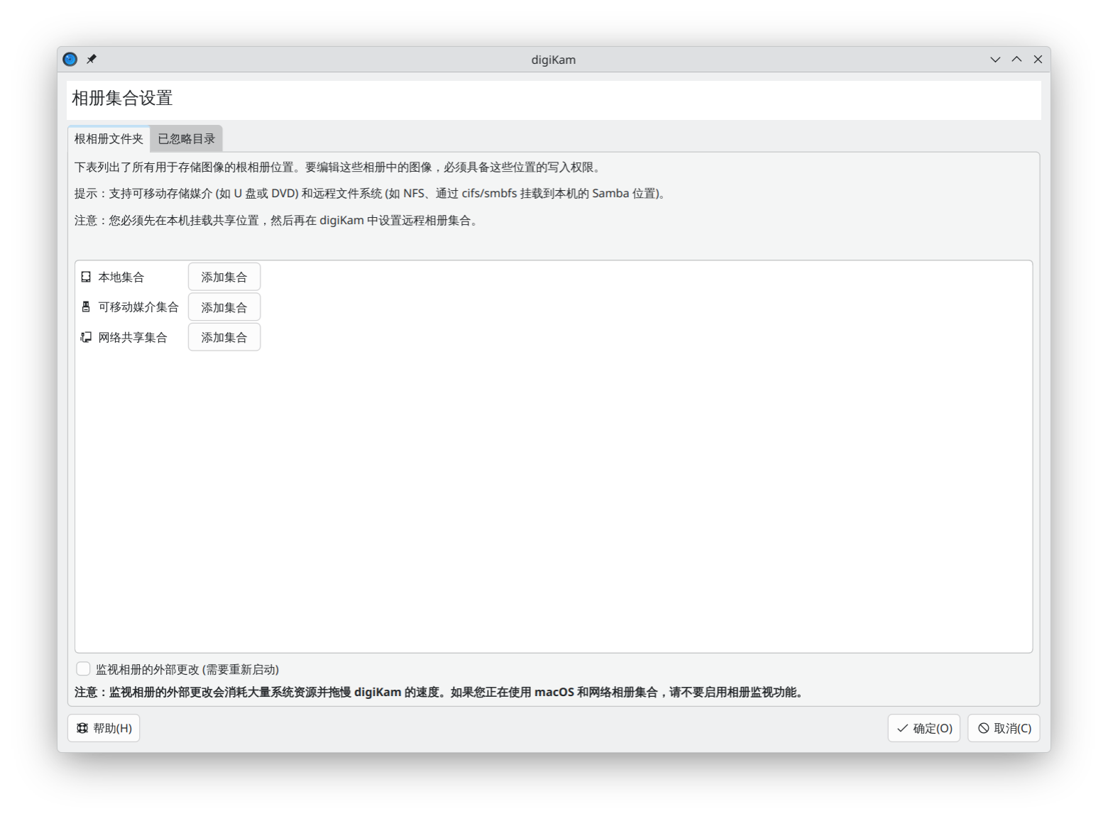 设置 - 配置 digiKam - 相册集合,本地数据添加「本地集合」即可,移动硬盘则为「可移动媒介集合」。